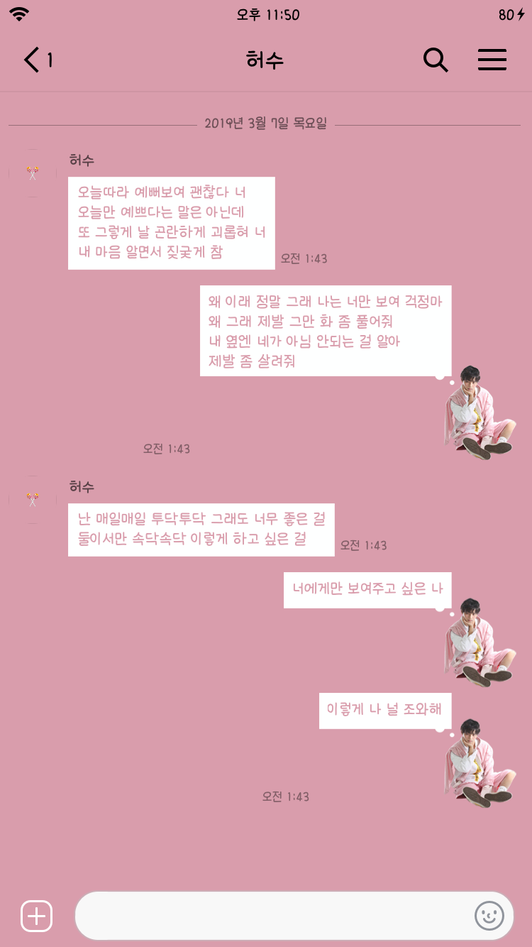 항상 오랜만에 오게 되는(...) 티스토리인데 약 두달 반만에 왔더니 티**리 아니고 네** **그인 줄 알았ㄴ ㅔ요... 이 어마어마한 플랫폼의 변화 무엇인지.... 공부하기 싫어서 딴 짓 하는 김에 아카이빙하고 갑니다. 사실 화이트데이 전후로 공유할까? 해서 만들었던 테마인데 말풍선 특성상 수정이 너무 어려워서 한 30번 넘게 수정했는데도 수정할 부분이 있더라구요. 더 손 대기도 지쳐서 저는 그냥 쓰는데 누군가에게 쓸래? 하고 보여줄만한 퀄리티는 아니어서 개인소장합니다. 사실 파일 백업 제대로 안 해둬서 그런 것도 맞음 (...)